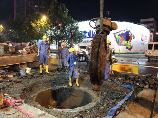6月8日晚上22:00時,在北至紅專路、南至鄭汴路東明路沿線附近,鄭州自來水三強公司五個維修項目部100余名職工在金水路與東明路等六個路口忙個不停,他們正在對9處大型閥門同時展開拆卸、更換工作?;椟S的路燈下,車稀人少,只有身穿藍(lán)色工裝和反光背心的施工人員忙碌的身影在不停地晃動,緊張施工。